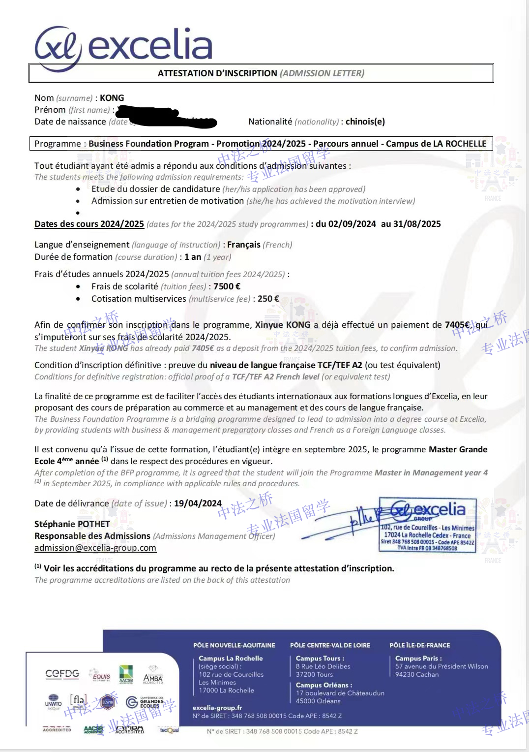 2024-2025拉罗谢尔告诉孔同学硕士录取