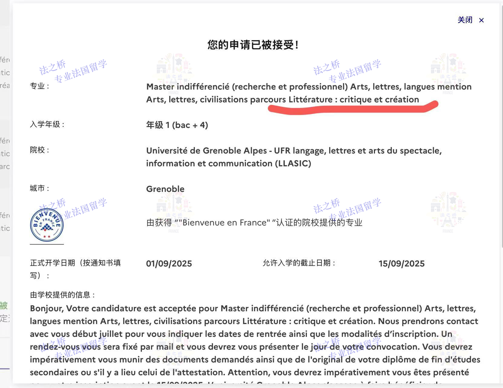 2025-2026法国格勒诺布尔大学M1年级文学批评与创作专业录取