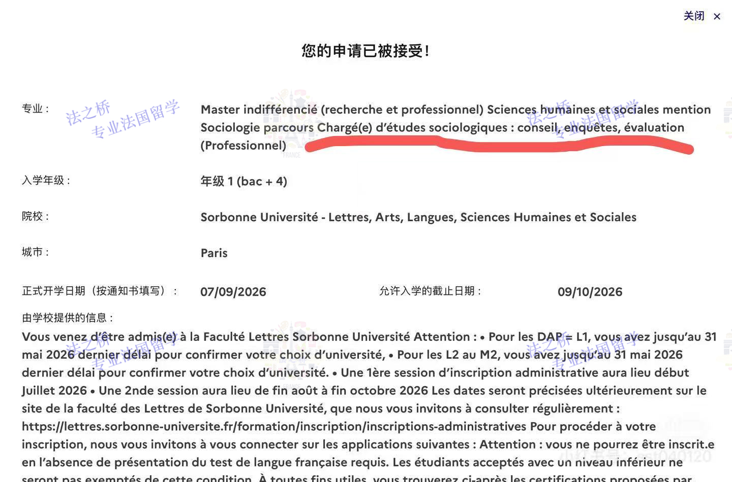 2026-2027年法国索邦大学M1年级社会学专业录取
