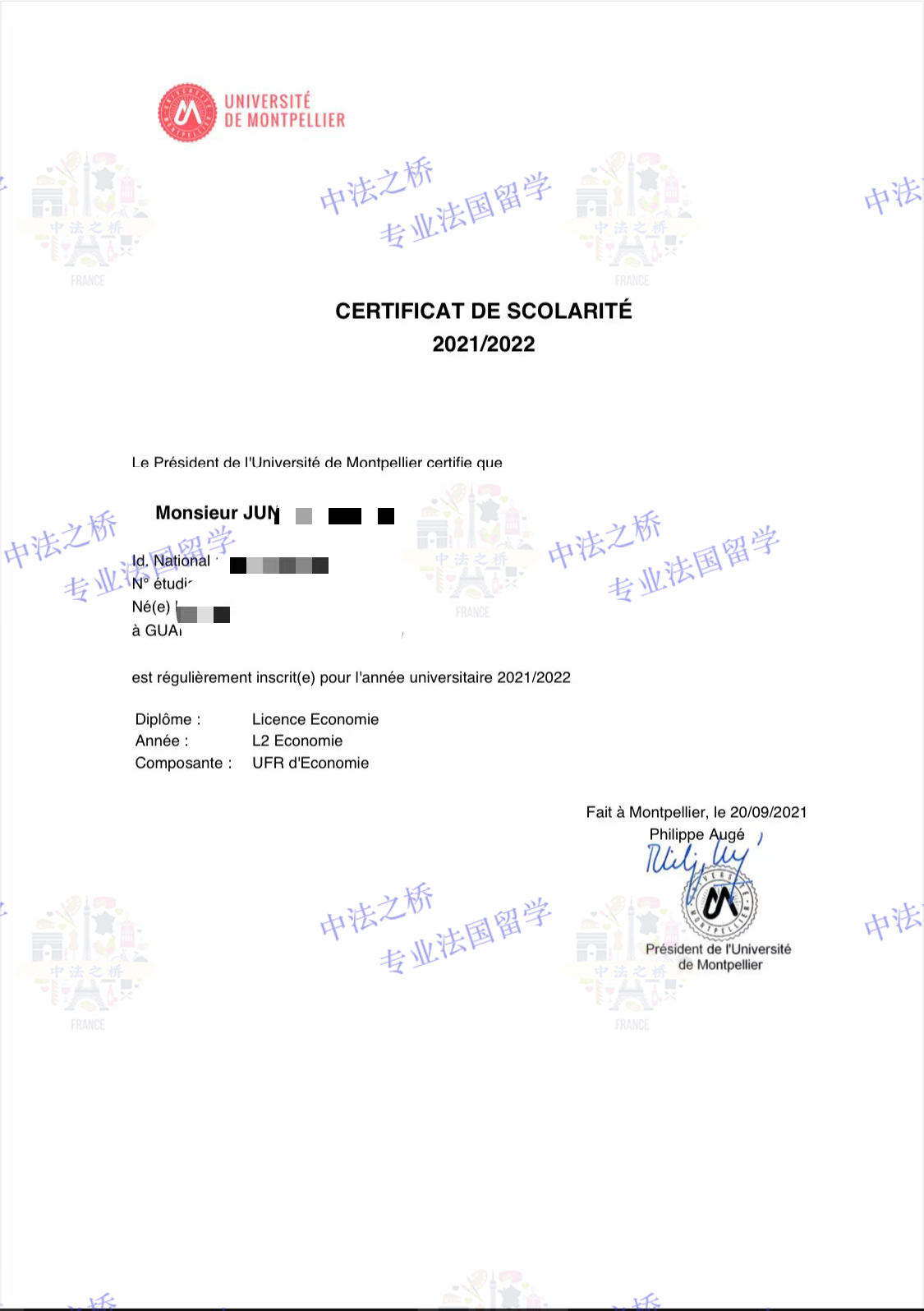 2021-2022法国蒙彼利埃大学经济学L2张同学录取