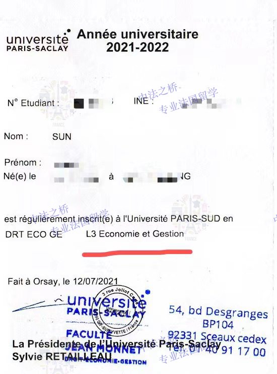 2021-2022法国巴黎萨克雷大学L3年级Économie et gestion 专业录取