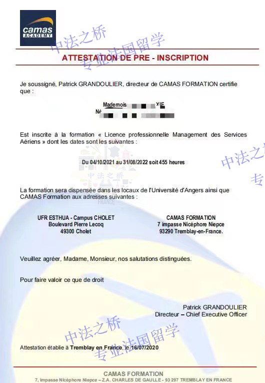 2021-2022法国昂热大学L3年级航空服务管理专业谢同学录取