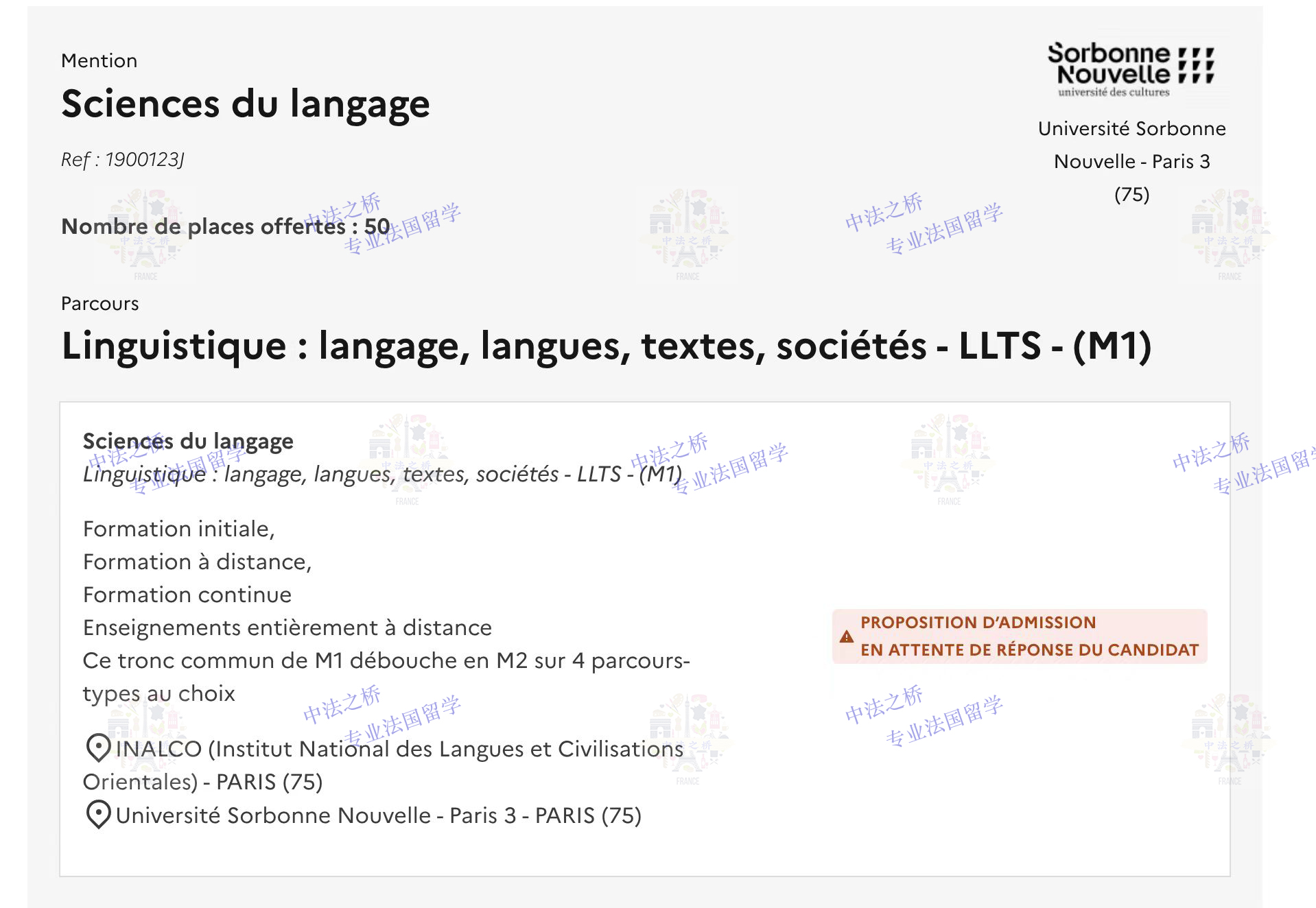 2023-2024法国巴黎新索邦大学M1年级Sciences du langage parcours:linguistique:langage,langues,tests,sociétés -LLTS-(M1)专业录取